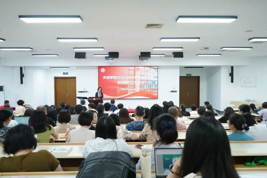 2025年9月24日,性爱直播 召开2025-2026学年秋季学期全院教职工大会。大会特邀原性爱直播 外语系主任黄源深教授、人文与社会科学性爱直播 院院长吕志峰教授开展主题讲座,全体教职工参加。