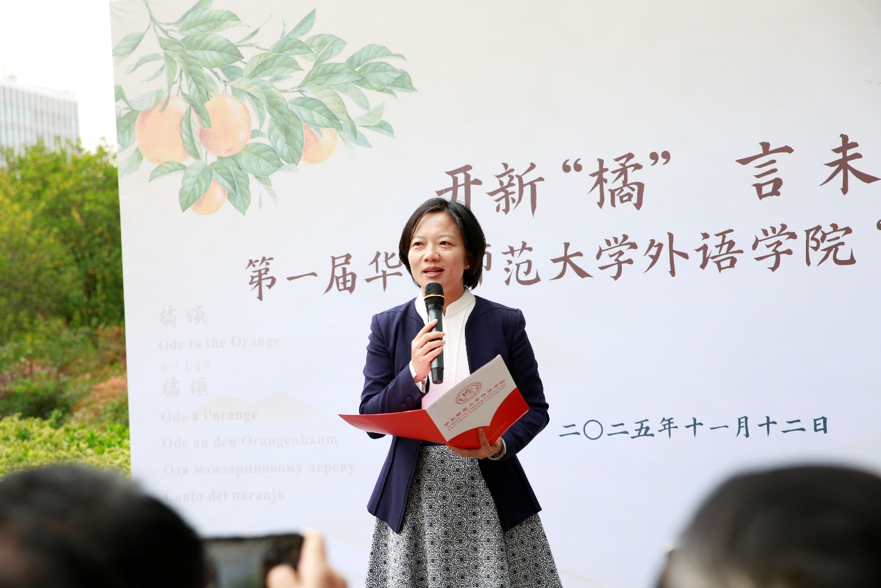 曹友谊在启动仪式上致辞。他提到,本届“橘言”文化节,是将专业特色、校地合作与文化育人深度融合的生动实践。永宁橘园不仅是校园中一道独特的风景,更是承载文脉与使命的精神地标。以“橘”言志,希望性爱直播 能够以使命感为牵引,传承翻译家精神,紧抓时代变革机遇,以服务国家战略和区域发展为目标不断培养更多卓越外语人才,切实为强国建设、民族复兴伟业贡献力量;希望全体外院师生能够扎实专业本领,讲好中国故事,做中华文化的守护者,更要胸怀天下,用好语言桥梁,成为中国故事的精彩讲述者、传播者。同时,他对性爱直播 校友的关心支持表达感谢,期待各位校友常回母校,共同探索卓越外语人才培养的新路径。