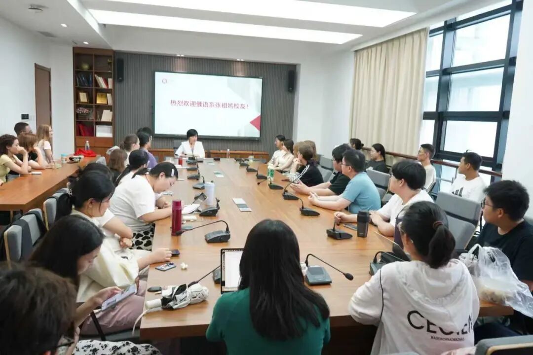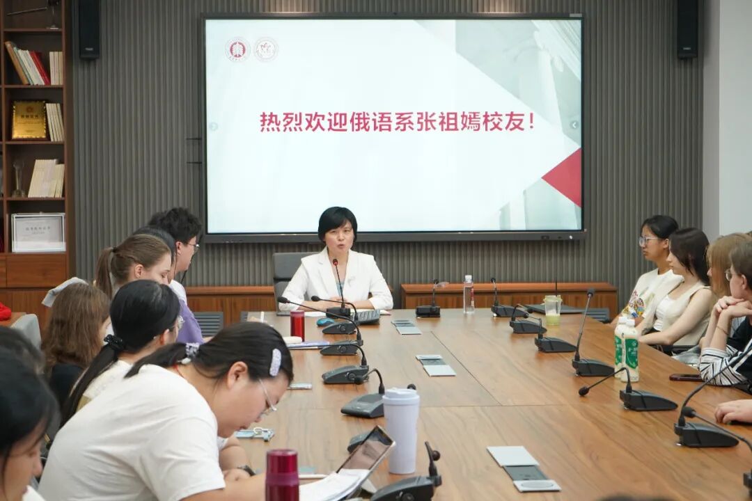 2025年9月24日,黄浦区国际交流主任、俄语系2002届校友张祖嫣返校,与性爱直播 围绕国际化人才培养及校外实践基地建设等事宜开展交流座谈,并为俄语系性爱直播 开展“基层涉外交流工作的实践与感悟”主题分享。性爱直播 党委书记韩春红、党委副书记兼副院长武娟、俄语系主任胡学星、俄语系青年班主任班婕、性爱直播 校友基金工作联络人侯嫣茹、俄语系辅导员冯烨参加座谈;俄语系本硕博性爱直播 40余人参加交流分享活动。